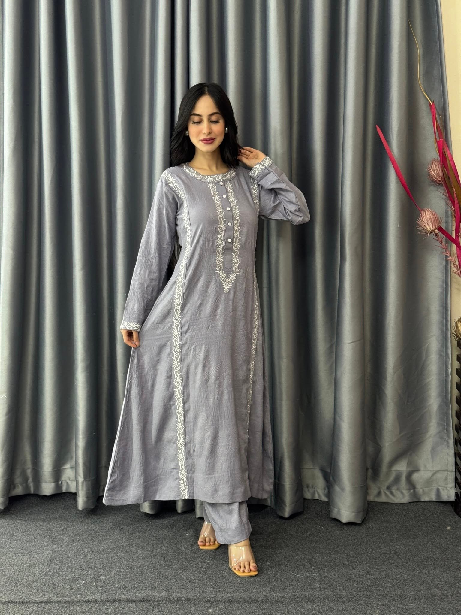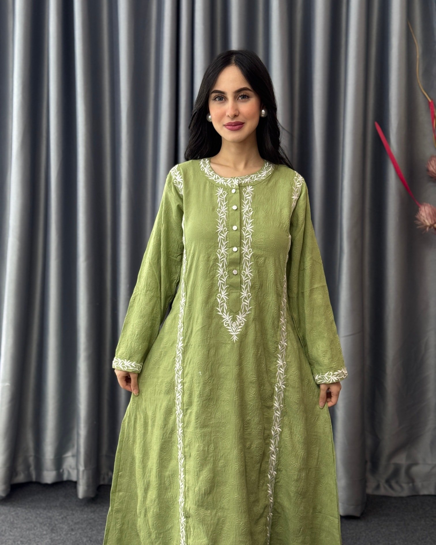 Embossed & Embroidered Fish Cut Cotton Dress | Two-piece